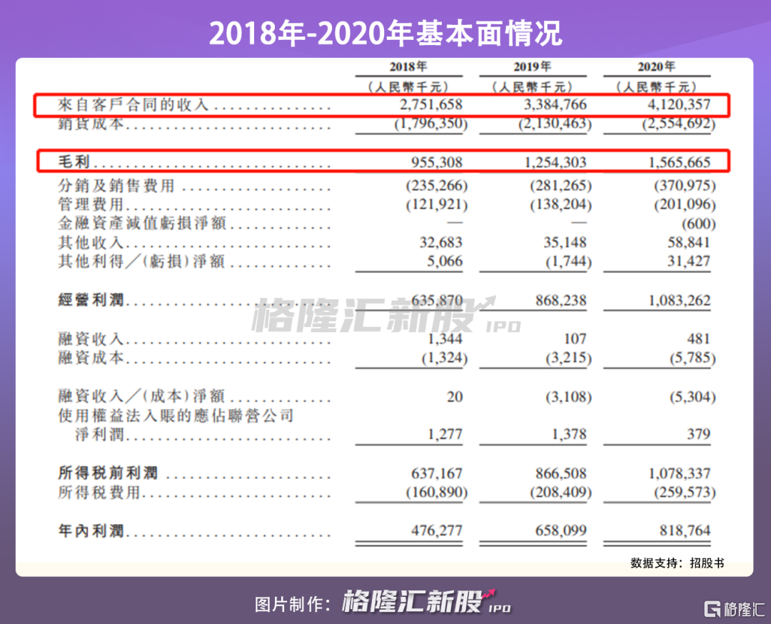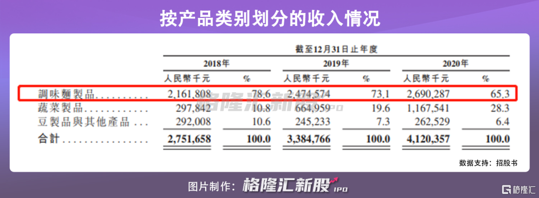 2018年-2020年期间,公司的总收入分别达到27.517亿元、33.848亿元及41.204亿元,2018年至2020年的年复合增长率达到22.4%。公司的毛利分别为9.553亿元、12.543亿元以及15.657亿元,但毛利率在报告期内分别为34.7%、37.1%以及38.0%,受调味面制品的售价上升以及产品组合改变影响,显出一定的放缓之势。