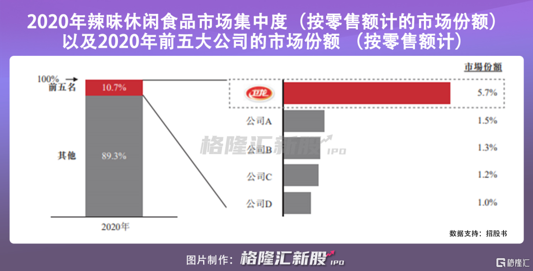 虽说辣味休闲食品市场相对分散,2020年前五大参与者的市场占有率为10.7%,但卫龙在其中排名第一,市场份额为5.7%。