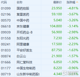 抗疫概念股普跌,国药控股跌4.81%,复星医药、中国中药、京东健康跌逾3%开拓药业、东阳光药等跟跌。