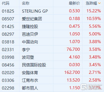 服装板块走强,STERLING GP涨15.22,爱世纪集团涨10.59,捷隆控股、芭迪贝伊涨超5%,中国动向、李宁、波司登、民信国际控股涨超3%。