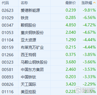 钢铁股普跌,爱德新能源跌9.81%,铁货跌6.56%,鞍钢股份、重庆钢铁、亚太资源、布莱克万矿业跌逾4%,西王特钢、马鞍山钢铁、中国东方集团等跟跌。