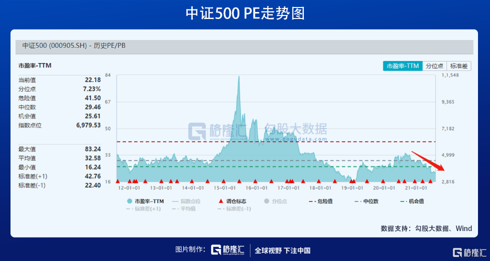 不过,以小盘股为主的中证500从去年7月便开启了大熊途,当前PE仅22倍,低于10年来估值下线,略高于2018崩盘的那一年。而2015年牛市高峰,中证500估值高达83倍。