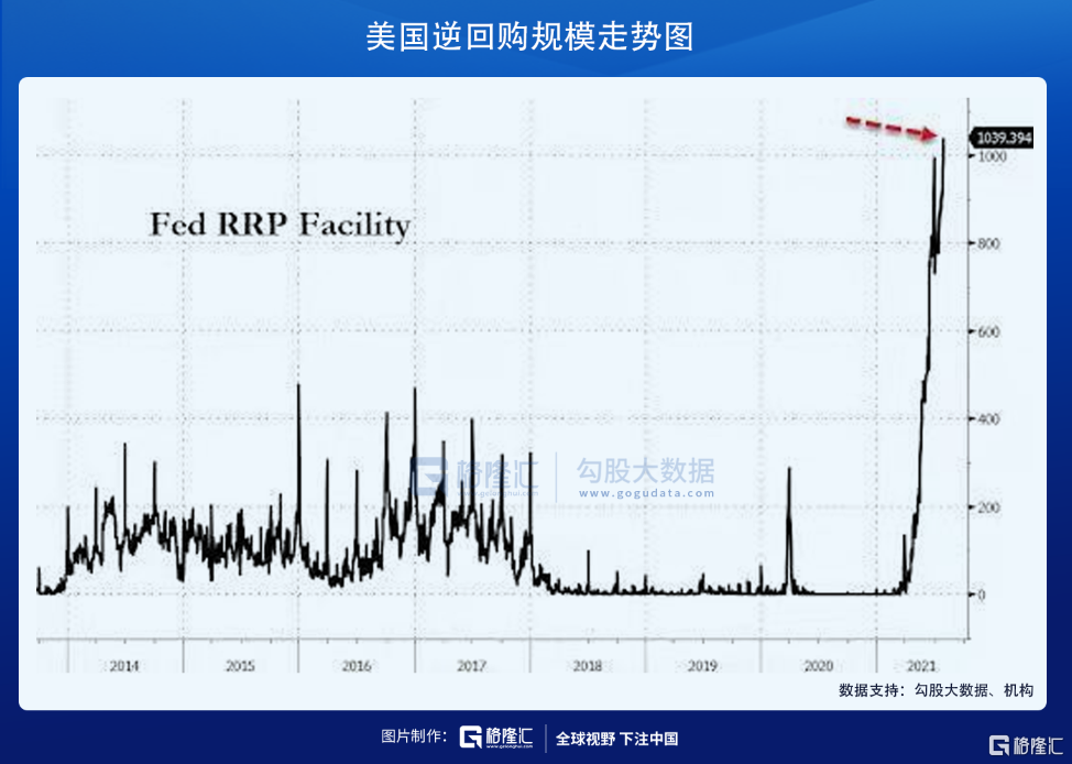 过去几个月,美国通胀愈发失控,但美联储不断安抚市场——通胀只是暂时。另外,美国金融市场流动性已经非常充裕,逆回购金额近日已经突破10000亿美元大关,但美联储仍然坚持每个月1200亿美元的购债计划。