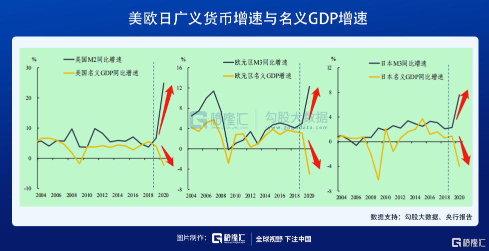2020年,美联储购买了约52%的新增国债,由此支持财政支出形成的货币供应量占美国新增M2的61%。去年末,美欧日货币供应量分别同比增长24.9%、12.3%和7.6%,而名义GDP增速分别为-2.3%、-5%和-4%,货币增长大幅偏离了名义GDP增速。从物价走势看,美国通胀形势最为严峻,两者之间的偏离也最大。