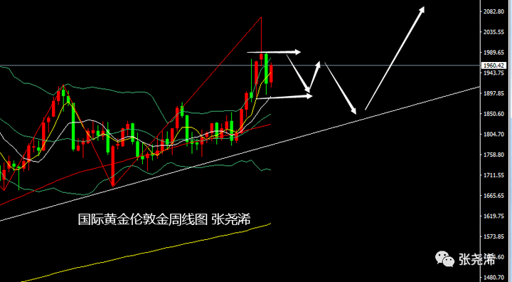 技术上:月图级别,金价目前多头力量有所回归,对于双顶附近的回落压力也相对减弱,附图指标信号整体看涨也再度增强,走势整体继续运行在中轨上方,暗示后市仍偏向上行,哪怕下个月继续回落,也将不破趋势线以及中轨支撑,多头也将就此再度开启牛市行情。不过技术上,还是偏向不破布林带上轨的遇阻保持一定的震荡行情,之后将会回落触及趋势线支撑然后再度走强。