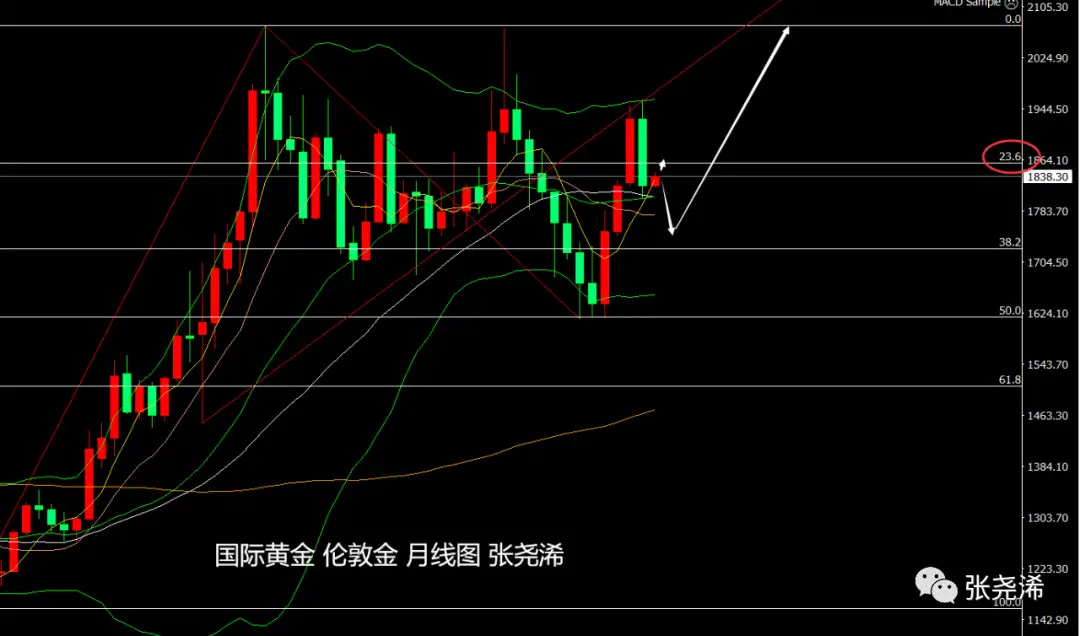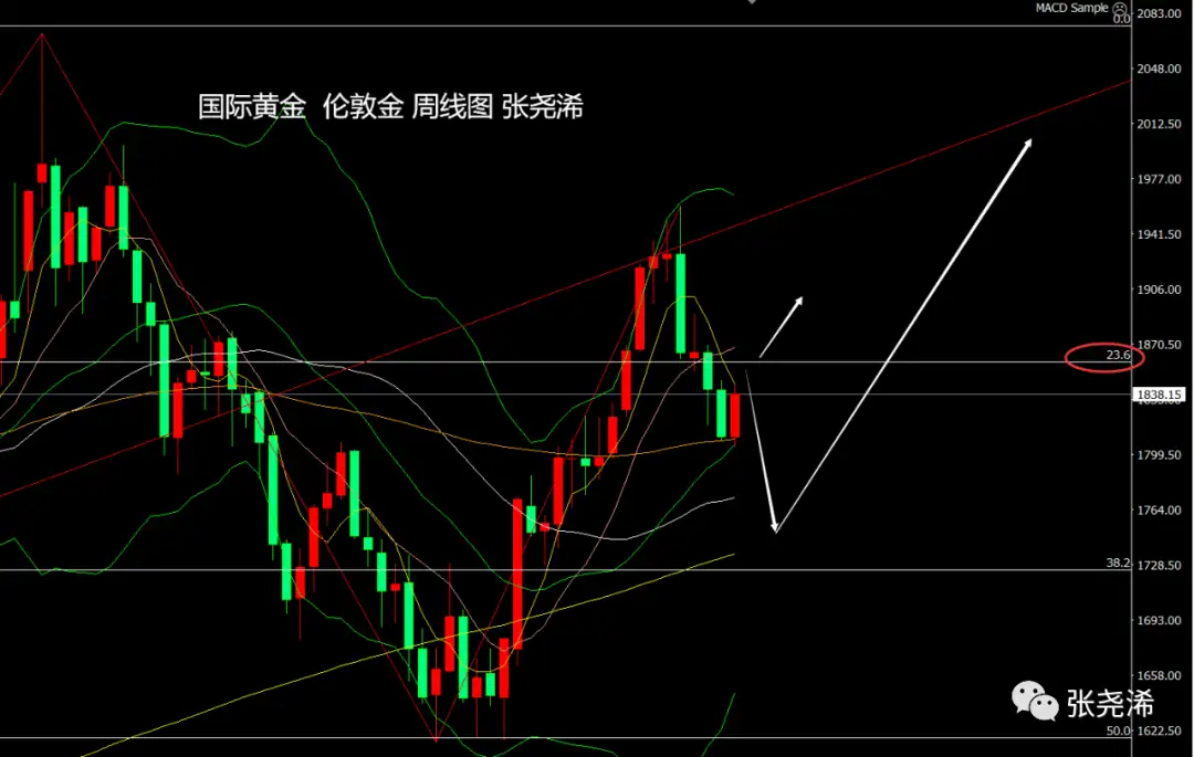 另外,值得注意的是,附图指标MACD整体趋势保持下行,这和主图走势对比,也有一定的顶背离迹象,也暗示后市将有产生大幅的回落力度,并有望触及之前一直说到的1525美元附近,但前提需先跌破60月均线支撑,但不管是如何跌,60月均线以及100月均线仍然是长期看涨买入的位置,短中期则关注周线信号为主即可。