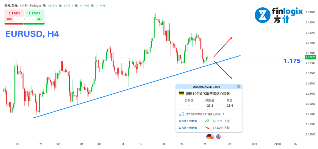 技术面:欧美货币对目前在关键支撑位1.175震盪,今日将公布的德国消费者信心指数将决定后续走向。根据Finlogix经济日曆过去三年的统计,若公布值大于预期值,欧元将有较大概率走升;但若低于预期,则可能引发欧元走跌,交易者日内可把握数据公布的短线行情。