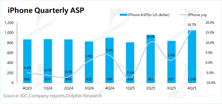 2、iPhone:$苹果(AAPL.US) 本季度 iPhone 业务实现营收 853 亿美元,同比增长 23.3%,远好于市场预期(782 亿美元)。本季度手机业务的增长,受 iPhone17 系列新品和美元贬值的影响。对于本季度,海豚君估算 iPhone 整体出货量同比增长 5.7%,出货均价同比上涨 16.7%。