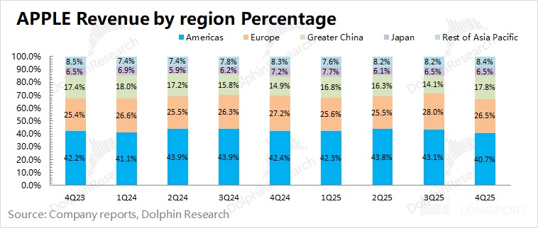 5、分地区收入:其中美洲地区依然是公司基本盘,收入占比维持在 4 成以上,本季度实现 11.2% 的同比增长;大中华区是本季度表现最好的地区,在 “加量不加价” 的政策之下,iPhone17 256G 新机也能享受国补政策,直接带动 iPhone 在中国大陆地区本季度销量同比增长 20%。