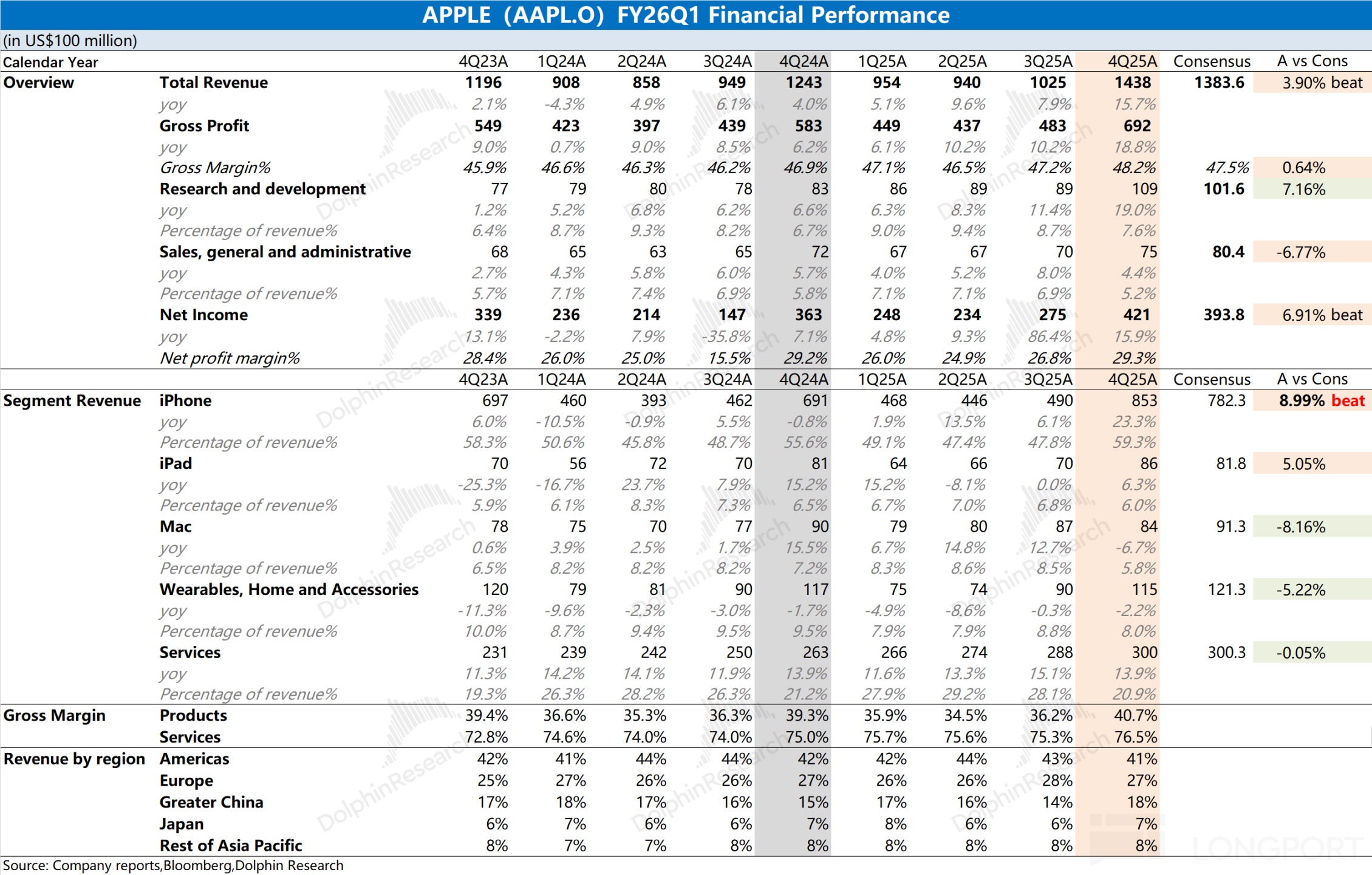 1.1 收入端:2026 财年第一季度(即 4Q25)苹果公司实现营收 1438 亿美元,同比增长 15.7%,好于市场预期(1383 亿美元)。公司本季度收入端的提升,主要受益于 iPhone、iPad 和软件服务业务增长的带动,而 Mac 和可穿戴等其他硬件业务表现有所下滑。