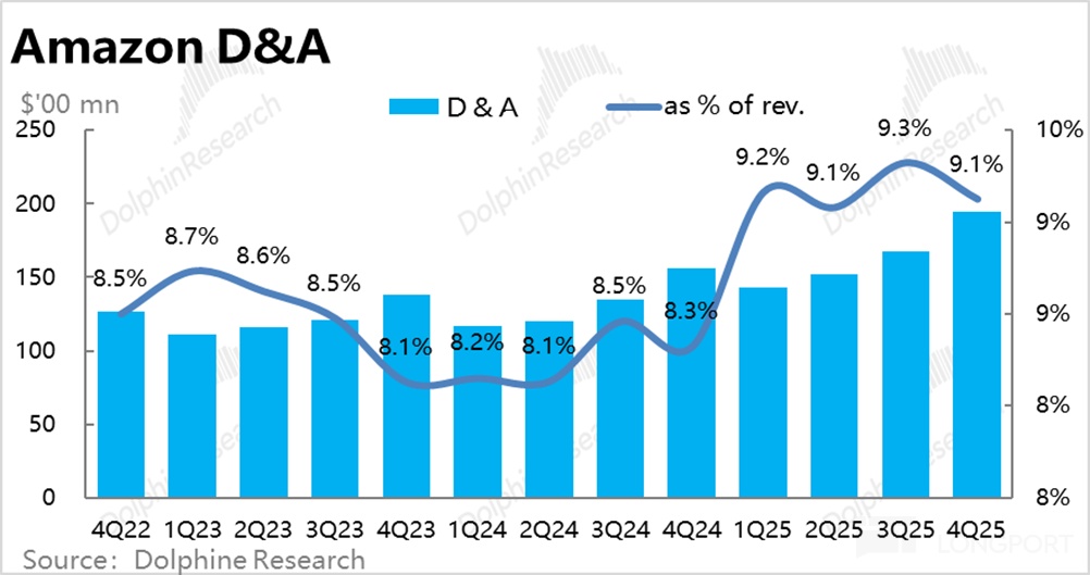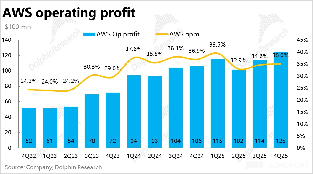 分板块看,AWS 本季的经营利润率不降反增到 35%,环比提升 0.4pct。如前文提及,本季 D&A 占比实际是下降的,应当是原因之一。