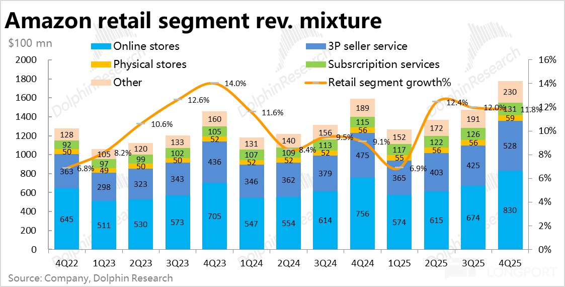 同样重要但当前不那么受关注的泛零售板块整体表现相对平稳。本季合计营收$1778 亿,同比增长 11.8%,增速较上季度稳中微降。