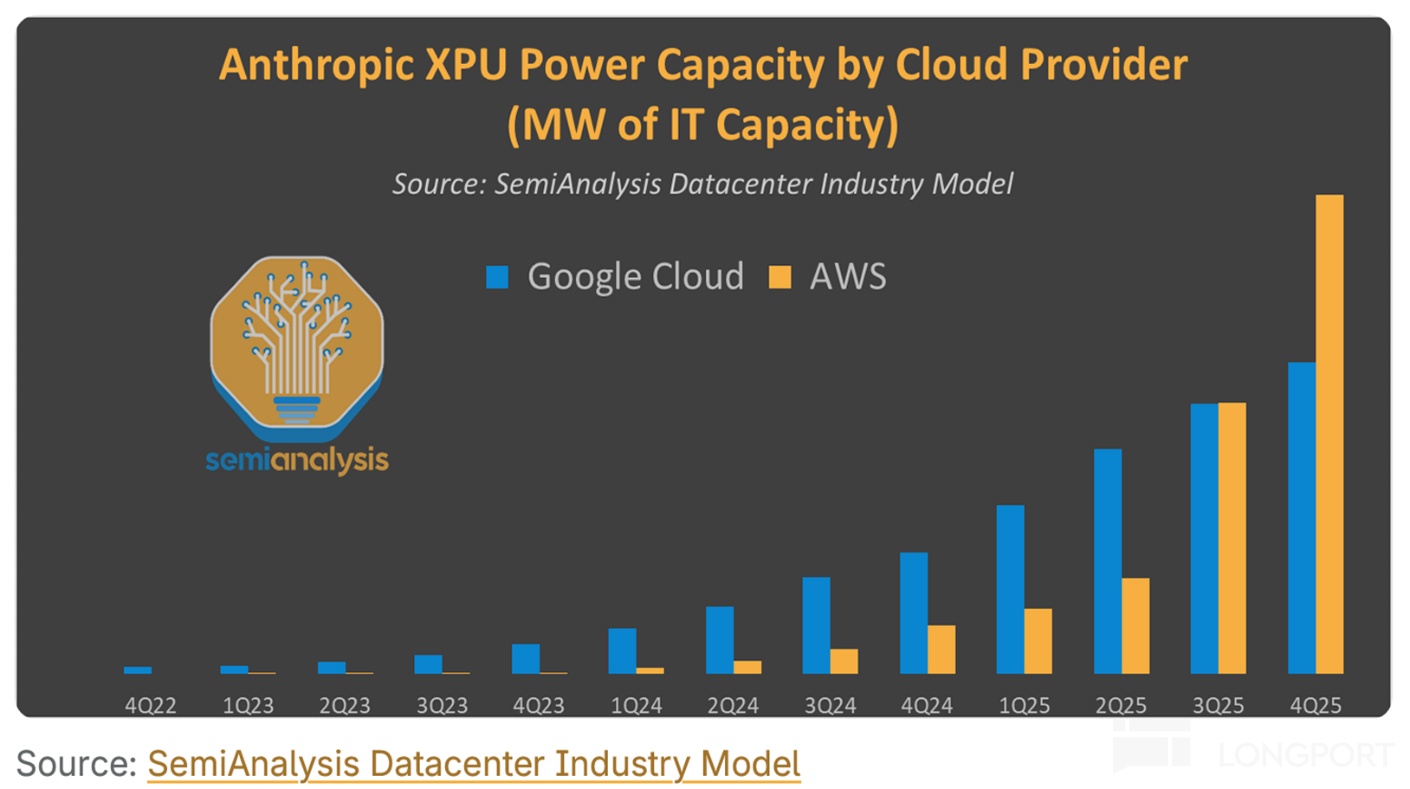 而此前与 Anthropic 的合作目前对 AWS 增长拉动并不显著的原因,除了 Anthropic 的体量和需要消耗的算力规模较 OAI 还是小很多外。另一原因据 Semi Analysis 报道,是因Anthropic 此前更多是使用 GCP,在 3Q25 到 4Q25 才转让大量使用 AWS。