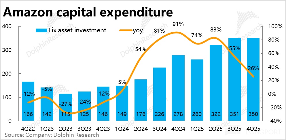 Capex 方面,本季支出$350、相比上季大体持平(微降 1 亿)。虽仍在高位但未进一步环比拉高,对应本季的在收入增长的摊薄下,D&A 占比相比上季反下降了 0.2pct。海豚君认为,这或许就是 AWS 本季利润率还不错的原因之一。