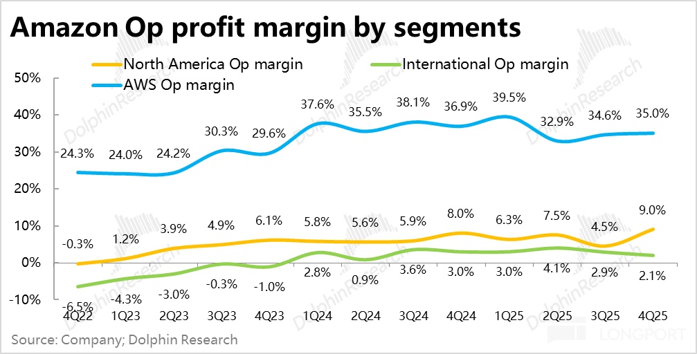 最关键的业务--AWS 的增速也如期有近 4pct 的明显提速,虽市场已有充分的预期,实际表现也还是小幅 beat。传统泛零售业务,虽不算亮眼,但至少增长稳健,利润率也在继续提升。因此,单看本季表现,确实并挑不出多少毛病。