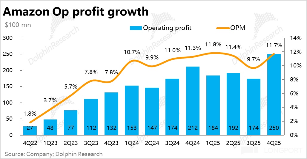 利润表现也不错,整体经营利润$250 亿,同比增长近 18%,同样小幅跑赢市场预期。整体经营利润率 11.7%,虽有高额 Capex、利润率仍逆势同比扩张了 0.4pct。