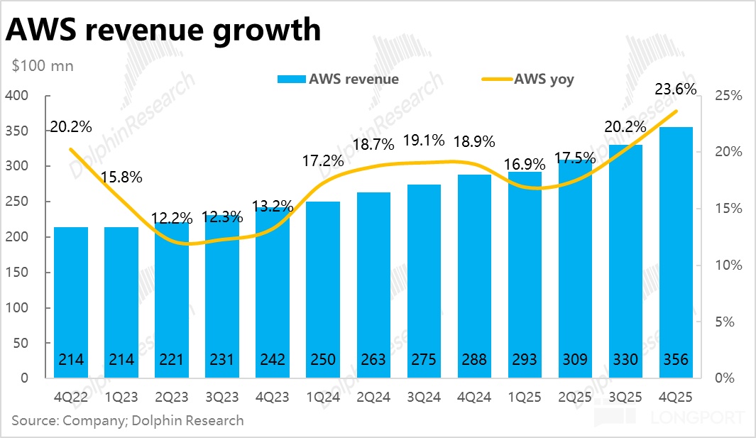 当前压倒一切、“决定生死” 的单一指标 -- AWS 本季营收同比增长 23.6% 到$356 亿(恒定汇率下增速类似),相比上季再度提速 3.4pct,相比年初增速已累计拉升 6.7pct。可以说如期交付了市场期待良久的 AWS 再提速。