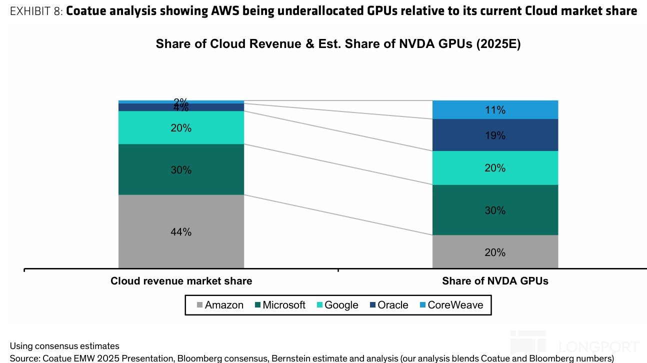 自研芯片对公司的最大意义,是有望加速解决亚马逊获得精尖英伟达芯片困难,导致算力爬坡持续受限的问题。此前 Coatue 的一个测算显示,AWS 做为最大的云服务商(份额 44%)却仅获得约 20% 的英伟达芯片,是头部云厂商中缺口最大的。