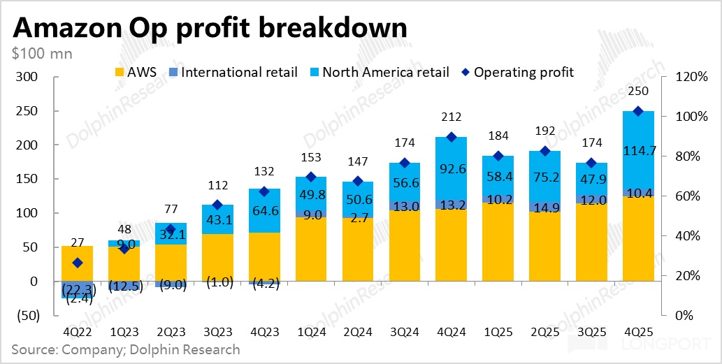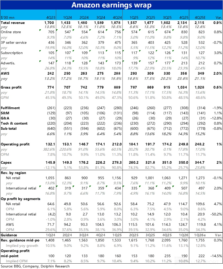 $亚马逊(AMZN.US) 于北京时间 2 月 6 日早美股盘后,公布了 2025 年 4 季度财报。整体来看,当季业绩表现同样不差,虽也有些瑕疵,但总收入和经营利润都略好于预期。核心 AWS 增速也如期显著提速,然而市场反应还是熟悉的 -- 即便当季业绩不错,依然暴跌。具体来看: