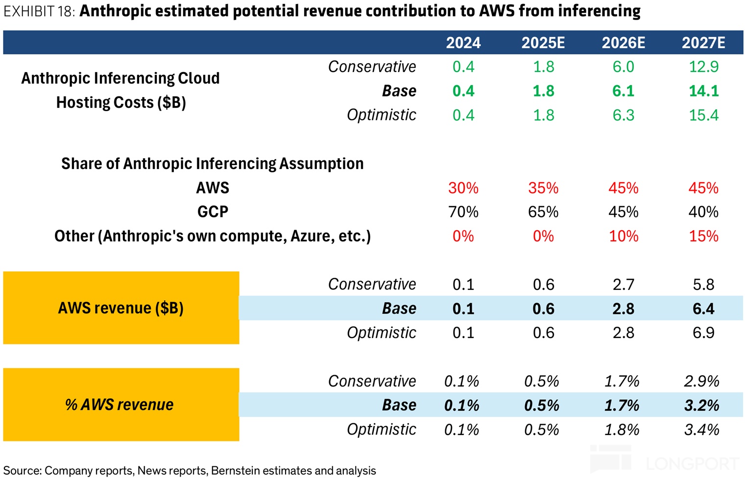 所以对 AWS 增速的拉动作用后续会更加明显,根据某外资行的测算, Anthropic 占 AWS 收入的比重会从 25 年的仅 0.5% 显著提升到 27 年的 3% 以上。